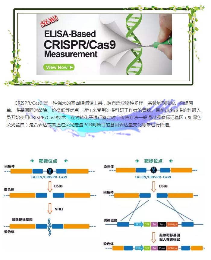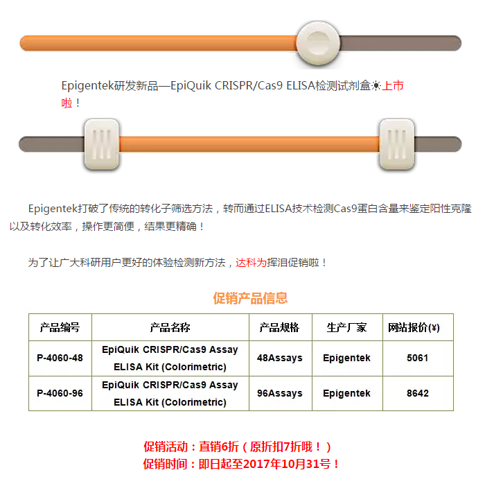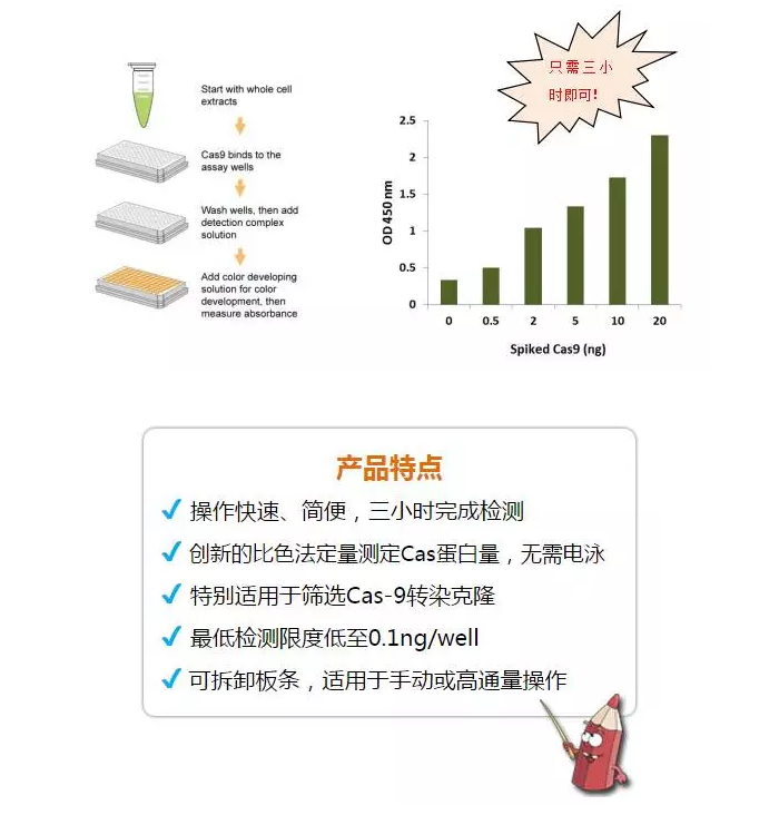 傳統方法操作復雜、花費大量時(shí)間與精力,針對這個(gè)特點(diǎn),Epigentek研發(fā)出了通過(guò)ELISA檢測Cas9蛋白含量,進(jìn)而篩選轉化子的檢測試劑盒。該試劑盒僅需要純化的Cas9 核酸酶和全細胞提取物(分離自各物種的組織和培養的細胞),就能夠特異性定量檢測CRISPR相關(guān)蛋白9(Cas9,dCas9)。
