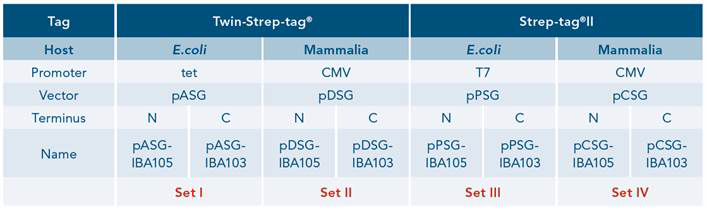 SetⅠ與SetⅡ為T(mén)win-Strep-tag?(三代純化標簽),SetⅢ與SetⅣ為Strep-tag?II(二代純化系統)標簽。每組載體包含兩個(gè)1μg帶Amp抗性的載體,分別為Tag在N-Term或C-Term的載體