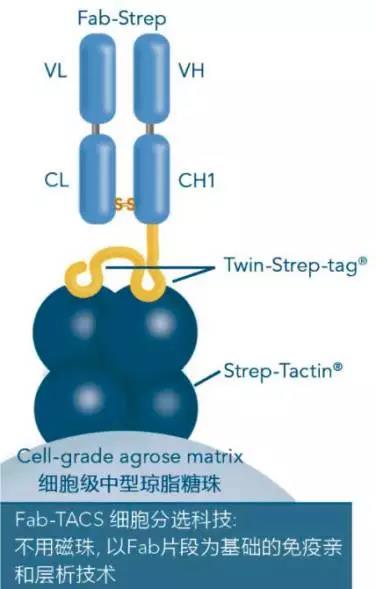 以Fab片段為基礎的無(wú)痕親和細胞分選技術(shù)(traceless affinity cell selection, Fab-TACS),由IBA Lifesciences根據其獨家的Strep-tag?/Strep-Tactin?蛋白純化系統發(fā)展而來(lái)。Fab-TACS運用免疫親和層析的原理,利用細胞表面抗原分子CD marker與Fab片段的特異性結合來(lái)進(jìn)行捕捉及釋放目標細胞。以不具磁性且可逆的試劑,取代一般具高親和力的完整抗體, 直接由全血或其他血液樣本來(lái)進(jìn)行溫和的標準化分選,因此能精準的提供您不含標記、未被活化的目標細胞。