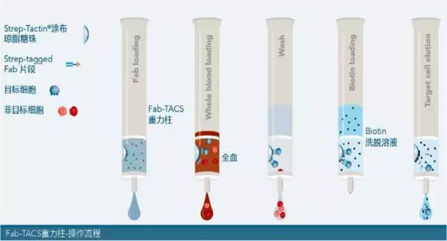 Fab-TACS重力柱內裝有經(jīng)Strep-Tactin?涂布的細胞級中型瓊脂糖珠(cell-grade agarose matrix),如此一來(lái),含有Twin-Strep-tag?的Fab片段(Fab-Streps)能與瓊脂糖珠結合。將全血或血液樣本加入重力柱,此時(shí)目標細胞會(huì )與Fab-Streps進(jìn)行特異性結合,非目標細胞則會(huì )直接流出。隨后,清洗重力柱將多余的非目標細胞或血液雜質(zhì)洗去。最后,加入生物素(biotin)中斷Fab-Streps與Strep-Tactin?間的結合,與此同時(shí),低親和力的Fab-Streps也會(huì )從目標細胞上解離,而您便能獲得不含標記、幾近原始的目標細胞來(lái)進(jìn)行后續的實(shí)驗。