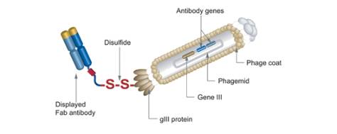 是一項篩選技術(shù),將外源多肽或蛋白與噬菌體的衣殼蛋白融合表達,融合蛋白展示在病毒顆粒的表面,而編碼該融合子的DNA則位于病毒粒子內。