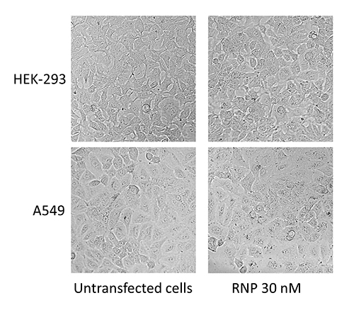在96孔板中用30nm RNP(Cas9蛋白和HPRT1 sgRNA)和0.3 μl的jetCRISPR?轉染HEK-293和A549細胞,轉染48h后,使用phase contrast ZOE Fluorescent Cell Imager (BIORAD?)觀(guān)察細胞狀態(tài)。