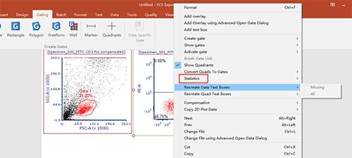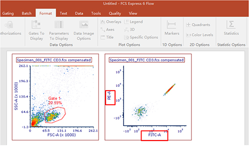 圈中目的細胞群,拖至空白處形成一個(gè)新的圖形,并根據需要改動(dòng)橫縱坐標軸的參數。本示例中以FITC和PE為例,調節此兩通道之間的補償。下圖所示,補償未經(jīng)過(guò)調節,FITC與PE之間有補償。