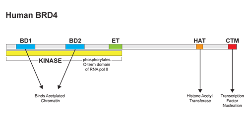 溴結構域蛋白的BET家族的主要特征是它們都存在兩個(gè)溴結構域和一種超末端(ET)結構域2,6。其中,BRD4是研究較深入的。 BRD4具有四個(gè)主要的分子功能:(i)可以通過(guò)結合乙?;M蛋白維持染色質(zhì)結構,這種活性是由它的N-末端結構域中的位點(diǎn)調控的; (ii)可以通過(guò)其HAT催化結構域發(fā)揮組蛋白乙酰轉移酶(HAT)活性2,6; (iii)絲氨酸激酶活性,主要作用于RNA pol II;(iv)C端結構域,可以發(fā)揮轉錄因子和復合物的結合和成核位點(diǎn)。研究發(fā)現,BRD4常出現在幾種轉錄復合物,包括常見(jiàn)的輔因子調控子和P-TEFb 延伸因子6。 其C端結構域也可以調控BRD4與許多眾所周知的轉錄調節因子之間的相互作用,顯著(zhù)的有:P-TEFb,MYC,NFκb 以及p532,4,6-8等。