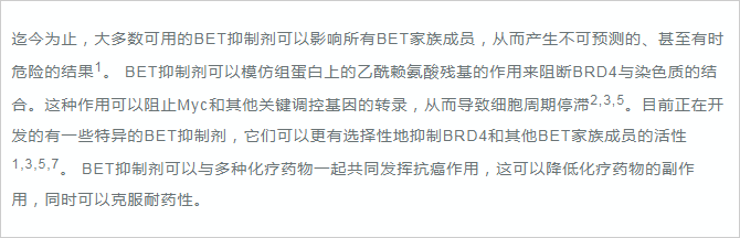 BRD4(溴結構域蛋白4)是一種轉錄調節因子。研究發(fā)現,BRD4在癌癥、自身免疫和炎癥性疾病中具有重要的作用1,2。 正常生理情況下,BRD4主要參與細胞周期過(guò)程中的基因表達調控,其可以與乙?;旧|(zhì)結合,保持各種基因在細胞分裂循環(huán)過(guò)程中的穩定表達 ,這種現象被稱(chēng)為表觀(guān)遺傳記憶或基因轉錄的“書(shū)簽”2,7。 同時(shí),BRD4在調控分化和發(fā)育中也起著(zhù)關(guān)鍵作用2,4。 如果BRD4缺失,骨髓干細胞將不能分化成為B和T細胞2。 BRD4亦是MEFs或B細胞重編程為誘導多能干細胞過(guò)程中重新表達干細胞基因所必需的,在成骨細胞分化過(guò)程中BRD4也發(fā)揮重要作用。 綜上,BRD4在細胞周期調控和分化中的重要作用使其成為癌癥和免疫系統疾病的新興治療靶點(diǎn)。
