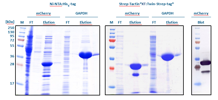 以SDS-PAGE分析發(fā)現,不管是mCherry或是GAPDH,使用Strep-tactin? XT: Twin-Strep-tag?都能得到純度較高的目標蛋白(見(jiàn)Elution)。Western Blot分析結果顯示,提取mCherry所出現的雜質(zhì)為其降解產(chǎn)物。