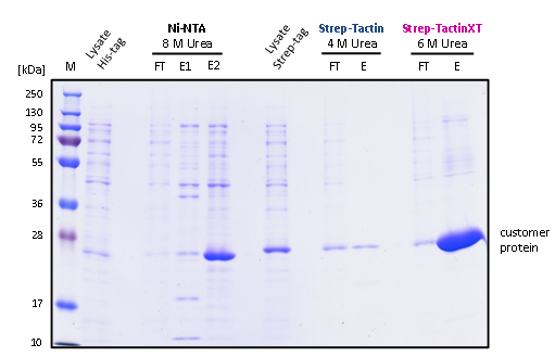 以SDS-PAGE分析發(fā)現,使用第三代Strep-tactin?XT能在使用6M尿素的變性條件下,得到大量高純度的蛋白;使用Strep-tactin?(4M尿素)得到蛋白量較少。而使用Ni-NTA雖然能在將pH值調降至4.5(E2)情況下,純化出靶蛋白,但得到的最終產(chǎn)物仍含有許多雜質(zhì)。