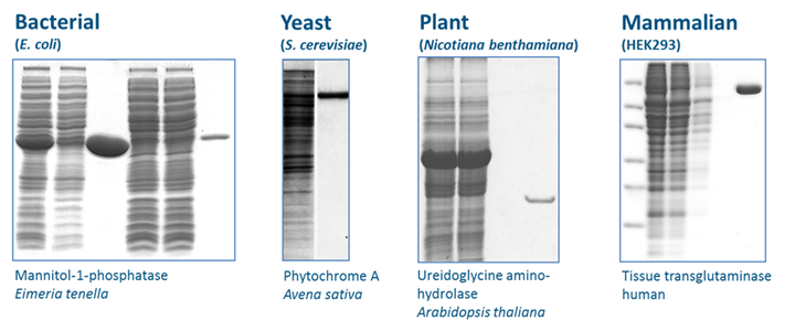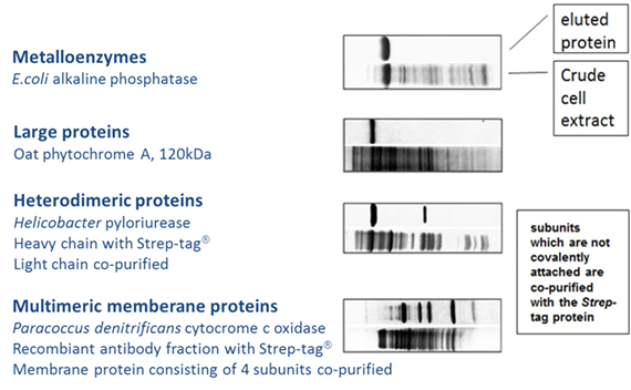 因His-tag系統使用Ni離子,所以在純化金屬蛋白(多數為酶)時(shí),可能會(huì )受到金屬間交互作用的干擾。而使用Strep-tag? 則不會(huì )出現此問(wèn)題,因為Strep-Tactin? XT與Strep-tag?的特異性結合不受金屬離子影響。且因其溫和的純化流程,所以還能用于純化大型蛋白、多亞基的蛋白復合體或是跨膜蛋白,并且保持蛋白功能。以Strep-tag?系統純化出不同的蛋白實(shí)例如下:
