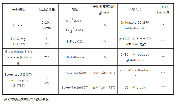 首先,需考慮選擇合適的親和標簽。常用于哺乳動(dòng)物表達系統的親和標簽有His-tag、FLAG-tag、GST-tag及Strep-tag?等[4-12],整理于下表: