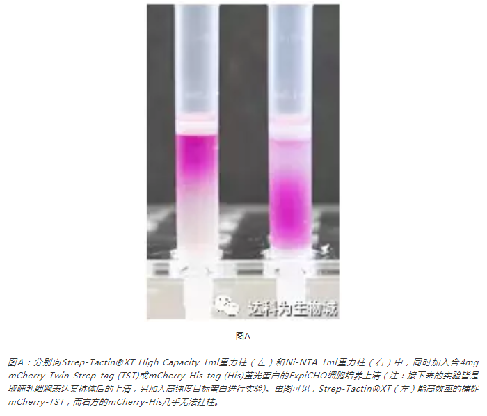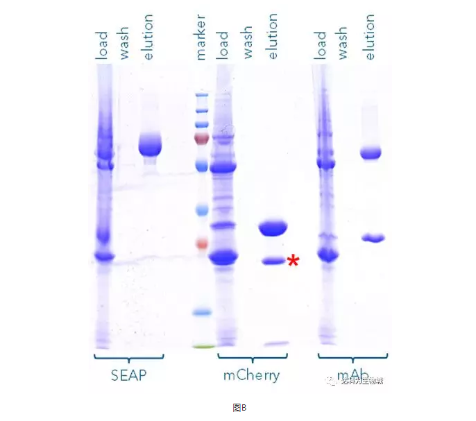 此外,我們也測試了其他的蛋白,例如SEAP(72 kDa)或抗體(mAb,其重鏈為55kDa)。圖B為以Strep-Tactin?XT純化SEAP-TST、mCherry-TST與mAb-TST的SDS-PAGE分析結果,可見(jiàn)對于不同蛋白,Strep-tag?系統都能純化出高純度的目標蛋白。(注:紅色標記處為 mCherry的降解產(chǎn)物,非雜帶)