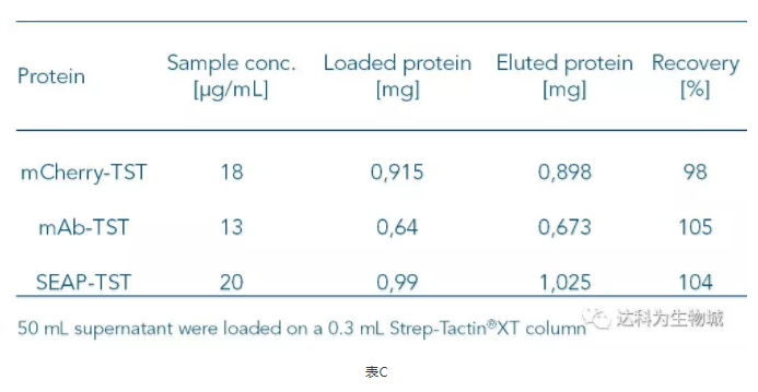 因Strep-Tactin?XT與Twin-Strep-tag蛋白的高親和力,即使目標蛋白的濃度低,使用Strep-Tactin?XT仍可以有效的捕捉上清中的目標蛋白。表C整理了幾個(gè)實(shí)驗的數據,顯示當目標蛋白濃度低于20μg/ml時(shí),得率仍能達到幾近100%。