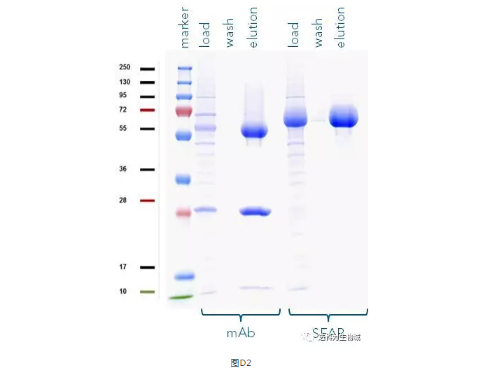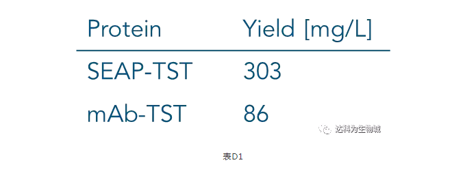 除了上述實(shí)驗所用的CHO細胞株外(中國倉鼠卵巢細胞),另一常用于生產(chǎn)蛋白的哺乳動(dòng)物細胞株為HEK293(人胚胎腎細胞),使用上較CHO簡(jiǎn)單。我們測試了Strep-Tactin?XT的純化表現:表D1為以Expi293表達SEAP-TST或mAb-TST蛋白后,目標蛋白的濃度。圖D2為純化表現的SDS-PAGE分析。從中可知,與ExpiCHO培養基相同,直接將表達好的Expi293上清加入1ml Strep-Tactin?XT高載量重力柱中進(jìn)行純化,一樣能夠快速的得到高純度的目標蛋白。