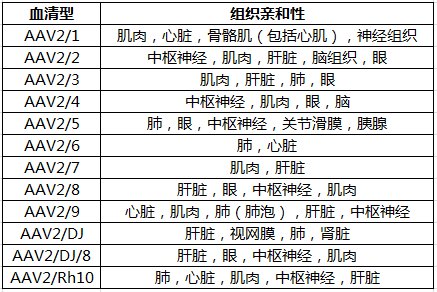 目前發(fā)現的AAV有AAV1~AAV11、DJ等12種不同的血清型,主要區別在于衣殼蛋白Cap的不同,并決定不同血清型AAV對不同的組織和細胞有不同的感染效率。