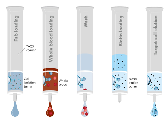 Fab-TACS柱子填充了包被有Strep-Tactin? 多聚體的細胞級瓊脂糖基質(zhì),偶聯(lián)上Strep-tag的Fab片段(Fab-Streps)特異性的結合到瓊脂糖基質(zhì)上。隨后,加入全血或其他血液制劑流過(guò)柱子。目的細胞通過(guò)特異性的與Fab-Streps作用從而結合到瓊脂糖基質(zhì)上,其他非目的細胞則有效的被洗去。最后,加入生物素使目的細胞從Fab-Streps上解離。至此,就已分離得到不帶任何標記的、真實(shí)的目的細胞可用于下游的實(shí)驗研究。