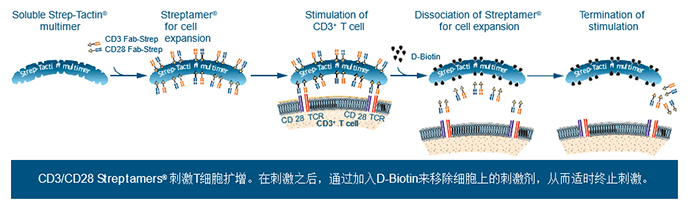 Streptamers?應用于T細胞擴增是目前T細胞擴增術(shù)中一項較新穎的技術(shù)。該技術(shù)的核心在于:將抗CD3和抗CD28的Fab-Streps結合到Strep-Tactin? 多聚體上,使它們形成可溶性的蛋白復合物。在刺激之后,通過(guò)加入D-Biotin來(lái)移除細胞上的刺激劑,從而適時(shí)終止刺激。