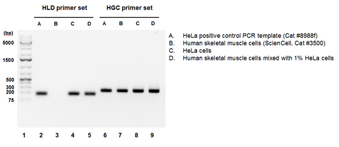 HeLa基因組DNA(gDNA)檢測引物組分(HLD)識別并擴增基因組中不存在于其他人類(lèi)細胞的HeLa細胞特異性序列。
