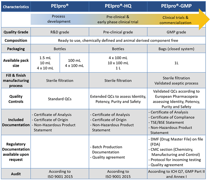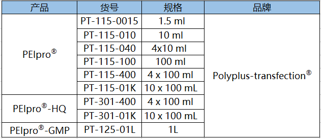 表1.Polyplus-transfection?提供一系列不同級別PEIpro?,滿(mǎn)足從工藝開(kāi)發(fā)、臨床前、到臨床級別病毒載體的生產(chǎn)需求