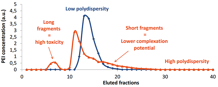 由于長(cháng)片段的PEI對細胞有毒性,而短片段PEI結合DNA能力較差(見(jiàn)紅色),所以?xún)?yōu)化PEI的片段大小,降低其分散性能減少細胞毒性,同時(shí)增加結合DNA的能力(見(jiàn)藍色)和轉染重復性。