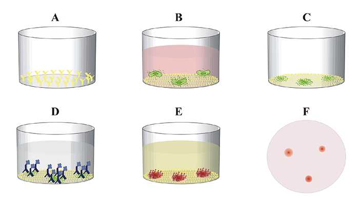 加入顯色底物,在酶的催化分解下,生成不可溶的色素,沉淀在膜上,即形成斑點(diǎn);斑點(diǎn)計數,結果分析。