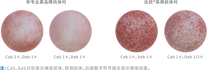 為實(shí)現ELISPOT檢測的高靈敏度,所用的信號放大系統——酶,要求純度高,催化反應轉化率高、專(zhuān)一性強、性質(zhì)穩定,制成的酶標抗體也必須是性質(zhì)穩定,且繼續保留活性部分和高效催化能力。對國際上不同公司開(kāi)發(fā)的最新通用性高效酶標抗體進(jìn)行對比性篩選試驗,一直作為達優(yōu)?系 列產(chǎn)品質(zhì)控及品質(zhì)升級的一項重要工作持續進(jìn)行,其首要目的就是保持試劑盒采用最佳的酶聯(lián)信號放大系統,達到最佳檢測效果。