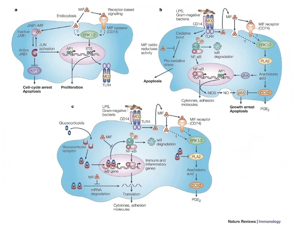 當用 LPS 刺激時(shí),巨噬細胞釋放 MIF。免疫細胞的其他促炎效應分子,如 TNF 和 IFN-γ,也是巨噬細胞產(chǎn)生 MIF 的強誘導劑。MIF 在組織或體循環(huán)中釋放后,作為一種經(jīng)典的促炎細胞因子,通過(guò)激活巨噬細胞和 T 細胞來(lái)促進(jìn)先天性和適應性免疫反應。