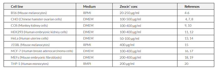 Zeocin?通常以100 μg/ml的濃度使用,即將原液(100 mg/ml in HEPES buffer)稀釋1000倍使用。但也需要根據您的具體細胞來(lái)確定最佳濃度。下表列出了在一些哺乳動(dòng)物細胞篩選實(shí)例中的Zeocin?建議濃度。