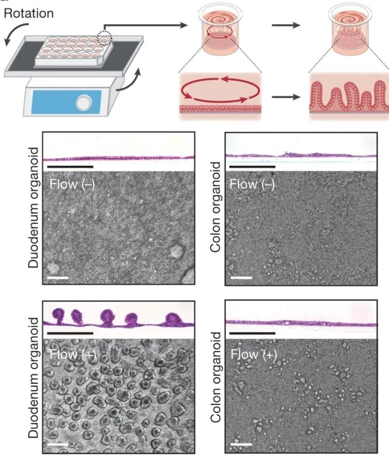 下圖為存在(+)或不存在(-)流動(dòng)的培養基的情況下培養四天的2D十二指腸和結腸類(lèi)器官的鏡下圖片。(蘇木精和曙紅染色)
