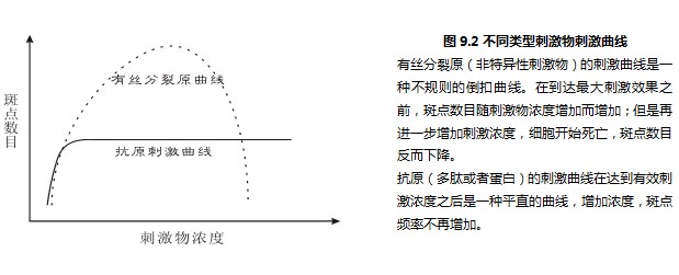 其一、非特異性的刺激物刺激效果不穩定。如圖9.2所示,非特異性的刺激物(有絲分裂原Mitogen)的刺激曲線(xiàn)幾乎沒(méi)有平坦的部分。也就是說(shuō),刺激物的濃度有細微變化,馬上就會(huì )體現在刺激斑點(diǎn)數目的變化上了,這樣實(shí)驗結果很難完全重現。相反,抗原的刺激曲線(xiàn)非常平坦,只要達到有效刺激濃度,斑點(diǎn)頻率就不再變化。