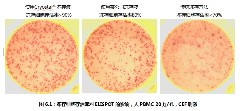 考慮到ELISPOT檢測的特殊性,荷蘭U-CyTech公司經(jīng)過(guò)精心的研究與反復的驗證,推出了Cryostar?凍存試劑盒,在凍存液中添加了一系列對細胞有特殊保護作用的保護劑。達科為公司在接到Cryostar?凍存試劑盒之后,在我們的實(shí)驗室以及國內數家客戶(hù)的實(shí)驗室做了細胞凍存與復蘇的實(shí)驗,并且對復蘇之后的細胞做了ELISPOT檢測。結果表明,淋巴細胞的存活率超過(guò)90%,ELISPOT斑點(diǎn)形成頻率與新鮮細胞完全相同。參見(jiàn)圖6.1。