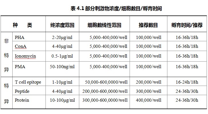 不論是普通多肽(比如重疊多肽庫)還是蛋白質(zhì)或者蛋白類(lèi)的組織提取物,這些刺激物都需要APC的攝取、內化、加工、呈遞,之后T細胞才能被刺激。所以,使用這些刺激物的時(shí)候,一定要保證足夠的細胞密度。根據我們的經(jīng)驗,細胞密度要至少達到20萬(wàn)-30萬(wàn)每孔。多肽推薦的細胞密度為30萬(wàn)/孔,蛋白推薦的細胞密度為40萬(wàn)/孔。也可以根據實(shí)際情況,在線(xiàn)性范圍內調整,參見(jiàn)表4.1與圖4.2。