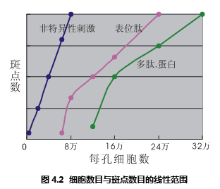 非特異性的刺激物可以直接刺激淋巴細胞,這種刺激不依賴(lài)于A(yíng)PC或者其它輔助細胞,是單細胞反應行為。所以它對細胞密度沒(méi)有要求,在極寬的細胞濃度范圍之內——多至40萬(wàn)/孔,低至5千/孔——斑點(diǎn)數量和細胞數量都有簡(jiǎn)單的正比例關(guān)系,參見(jiàn)圖4.2。但是考慮到,只有恰當的斑點(diǎn)數目才便于數據統計,所以推薦細胞密度為10萬(wàn)/孔。如果細胞數目過(guò)多,滿(mǎn)孔都會(huì )被斑點(diǎn)覆蓋,并且相互重疊。