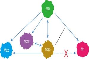 不同類(lèi)型巨噬細胞的表型轉換。M0型巨噬細胞可以在不同誘導劑的作用下極化為M1或M2(M2a、M2b、M2c)。M2b型巨噬細胞可以在不同刺激下轉換為M2型巨噬細胞的其他亞型。值得注意的是,M2b型巨噬細胞抑制從M0到M1的轉換。此外,在M1刺激劑的條件下,M2b型巨噬細胞不能重新極化為M1型。