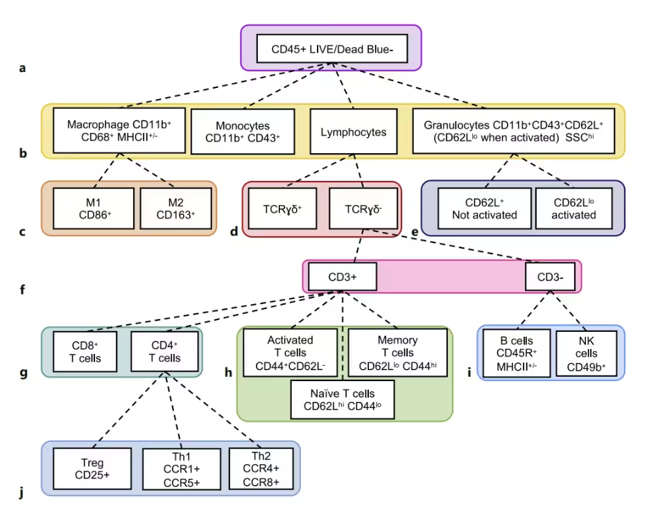大鼠模型是生物醫學(xué)研究中重要的資源,因與人類(lèi)免疫系統相似,而常被用于免疫相關(guān)的功能研究。然而目前小鼠模型在基礎和機制免疫學(xué)研究中占主導地位,相對缺乏對大鼠模型中免疫細胞的流式分析鑒定。本文將分享對大鼠常見(jiàn)免疫細胞的流式鑒定方案,鑒定分析不同組織中的粒細胞、巨噬細胞、T細胞、B細胞及NK細胞。