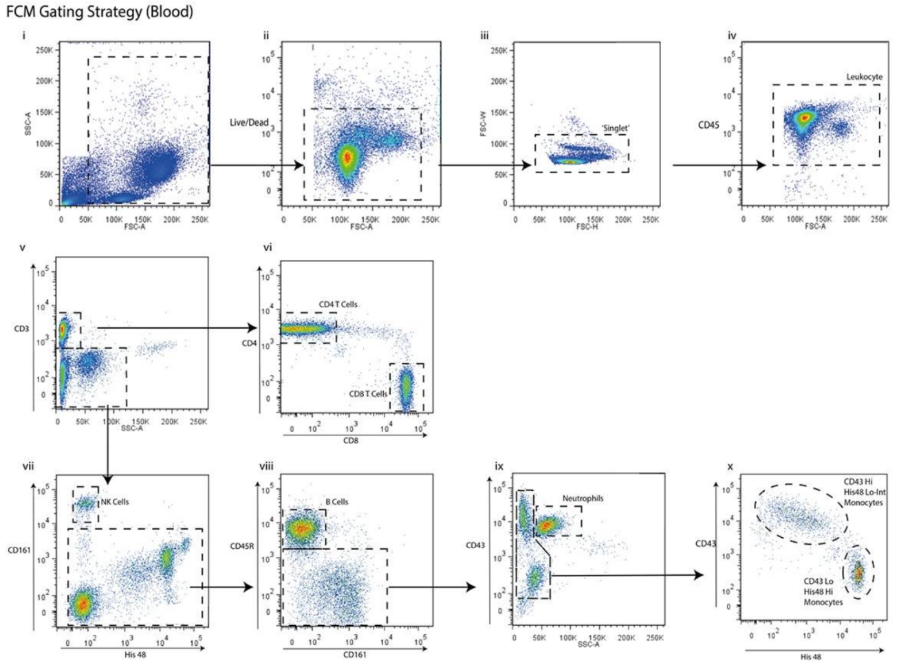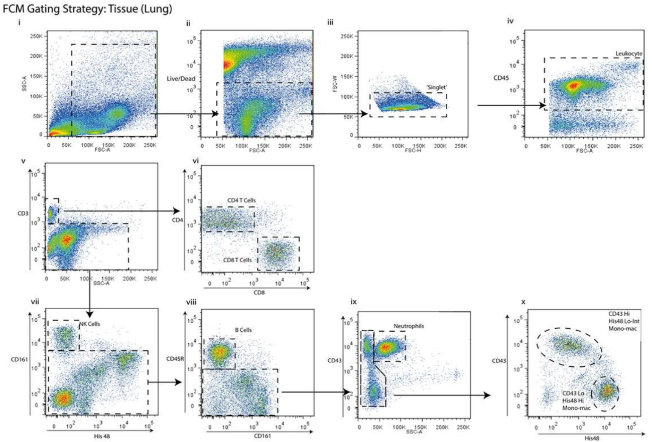6. 單核細胞:從CD45+CD3-CD161-CD45R-CD43-/lo的細胞中,利用CD43和His48的差異表達圈出兩個(gè)單核細胞亞群 ——CD43LoHis48Hi 和 CD43HiHis48Lo-Int(x)。