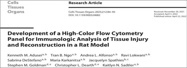 [1]Adusei KM, Ngo TB, Alfonso AL, Lokwani R, DeStefano S, Karkanitsa M, Spathies J, Goldman SM, Dearth CL, Sadtler KN. Development of a High-Color Flow Cytometry Panel for Immunologic Analysis of Tissue Injury and Reconstruction in a Rat Model. Cells Tissues Organs. 2023;212(1):84-95.