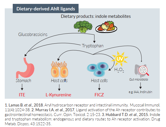 除了像2,3,7,8-四氯雙苯環(huán)二噁英(TCDD)的環(huán)境中的異質(zhì)物,多種膳食來(lái)源的AhR配體也已經(jīng)被鑒定出,而其中許多是色氨酸(Trp)氨基酸代謝的副產(chǎn)物4?,F在A(yíng)hR已被認知為宿主微生物群落共生的調節因子。一方面,膳食配體激活的AhR幫助塑造腸道細菌組成5,另一方面,AhR傳感能夠調節腸道免疫細胞的穩態(tài)和功能6。