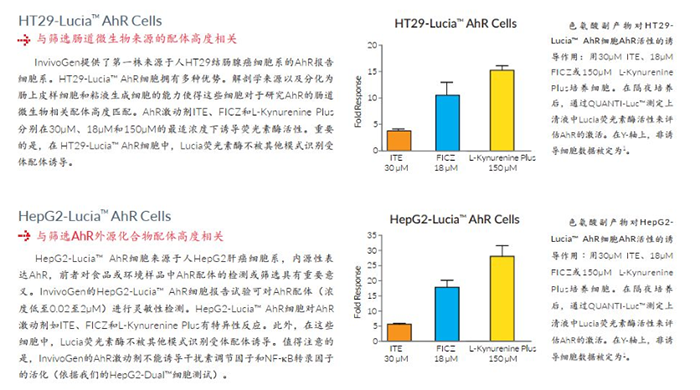 InvivoGen提供兩個(gè)AhR報告細胞系,分別改造自人HT29結腸腺癌和HepG2肝癌細胞系。HT29-Lucia?AhR細胞和HepG2-Lucia? AhR細胞有助于研究AhR激活作用,可以幫助了解多種激動(dòng)劑如外源物質(zhì)和飲食衍生的吲哚產(chǎn)物對AhR的激活反應。最重要的是,我們的AhR報告細胞是人源細胞,并且內源性表達人AhR,這使得它們與人類(lèi)樣本中篩選內源性AhR激動(dòng)劑高度相關(guān)。