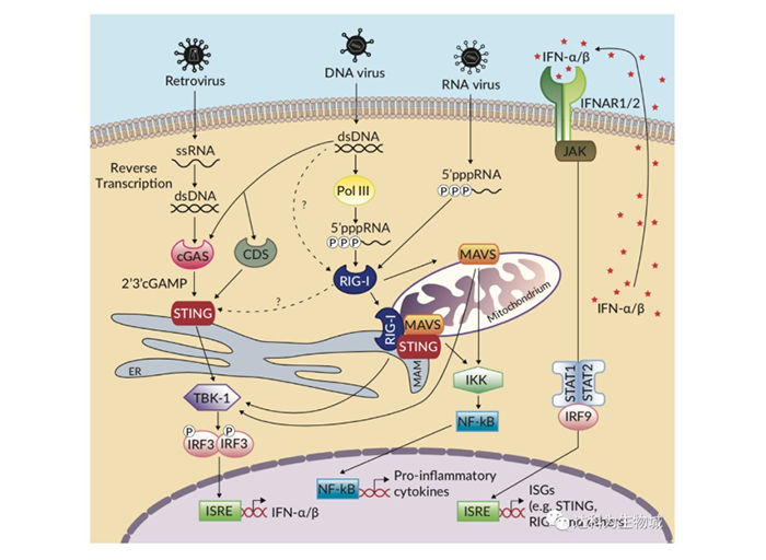 天然免疫系統對于限制病毒感染作用重大。其依靠若干組模式識別受體(PRRs)來(lái)識別病毒核酸[1]。這些PRRs包括胞漿DNA感受器(CDS),環(huán)鳥(niǎo)苷酸腺苷酸合成酶(cGAS),和細胞質(zhì)RNA感受器視黃酸誘導基因I(RIG-I)。這些受體一旦被活化, 將誘導不同的信號通路導致一系列抗病毒分子的產(chǎn)生。有趣的是,有證據表明,這些信號通路之間存在緊密聯(lián)系以增強抗病毒反應。