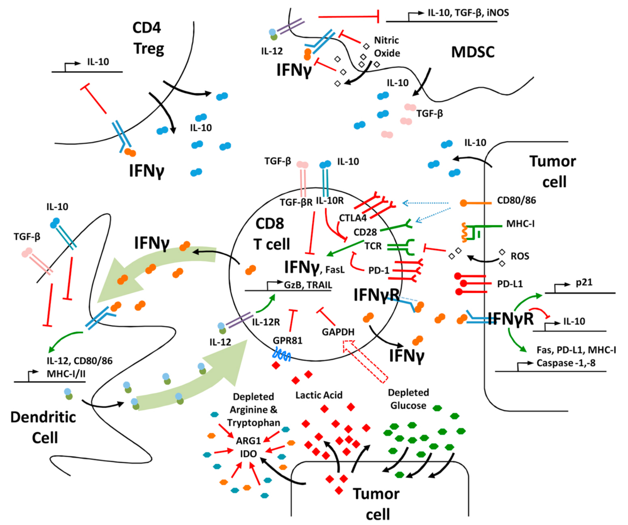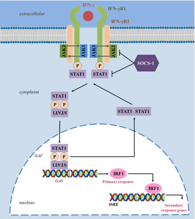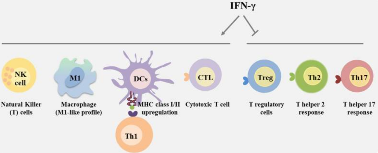 IFN-γ信號通路協(xié)調多種生物反應,在先天和適應性免疫中扮演的重要角色。IFN-γ可以通過(guò)促進(jìn)Th1細胞、CD8+T淋巴細胞、NK細胞、樹(shù)突狀細胞及巨噬細胞的活性,抑制Treg、Th2和Th17細胞分化和功能,發(fā)揮免疫調節作用。此外,IFN-γ可激活巨噬細胞,使其分化為M1型巨噬細胞。